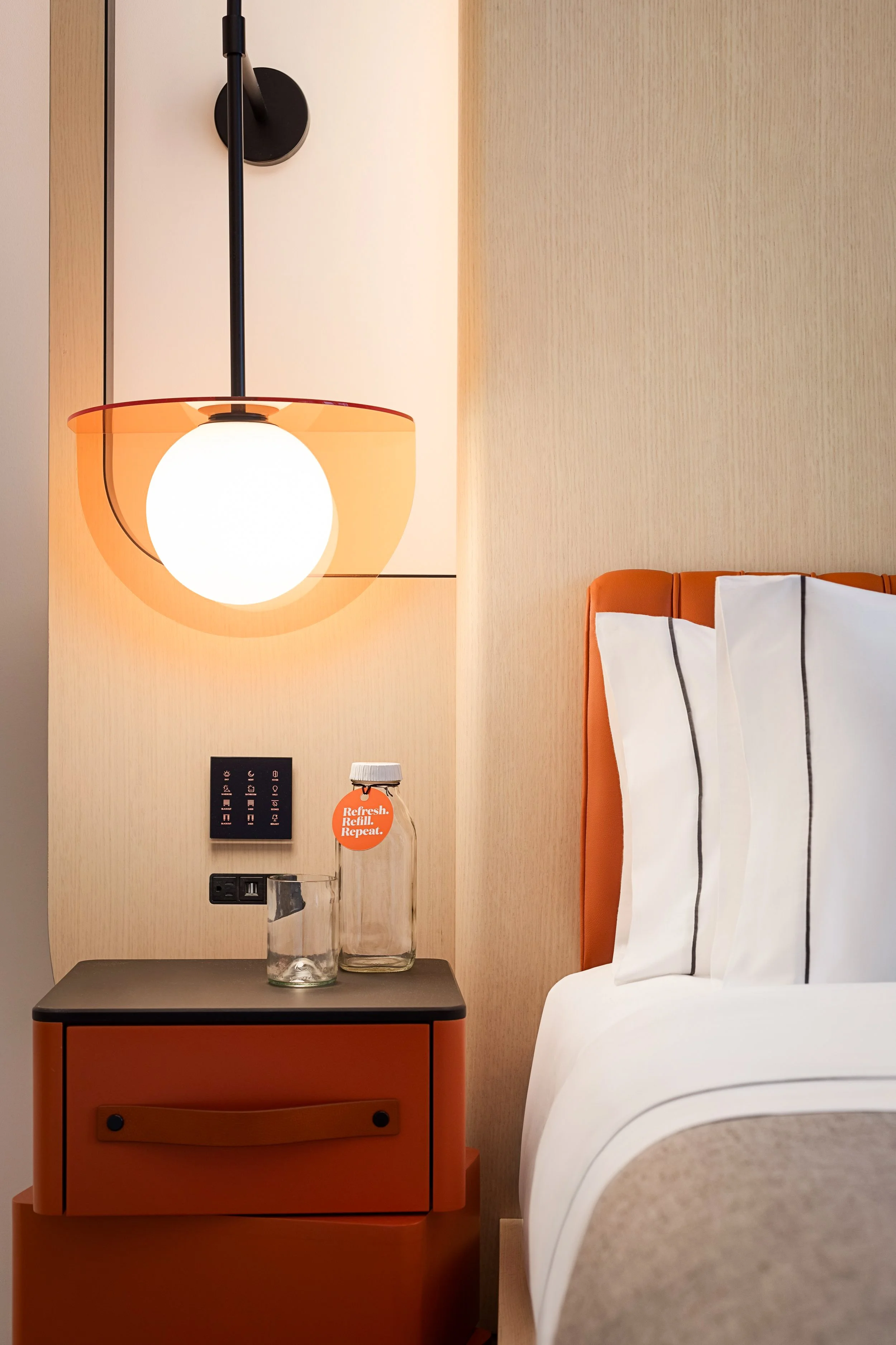 Close-up of a modern hotel bedside table with a glass water bottle, a glass, and a hanging orange tag that says 'Refill. Refill. Repeat.', next to a bed with white pillows and an orange headboard, and a contemporary hanging lamp above.