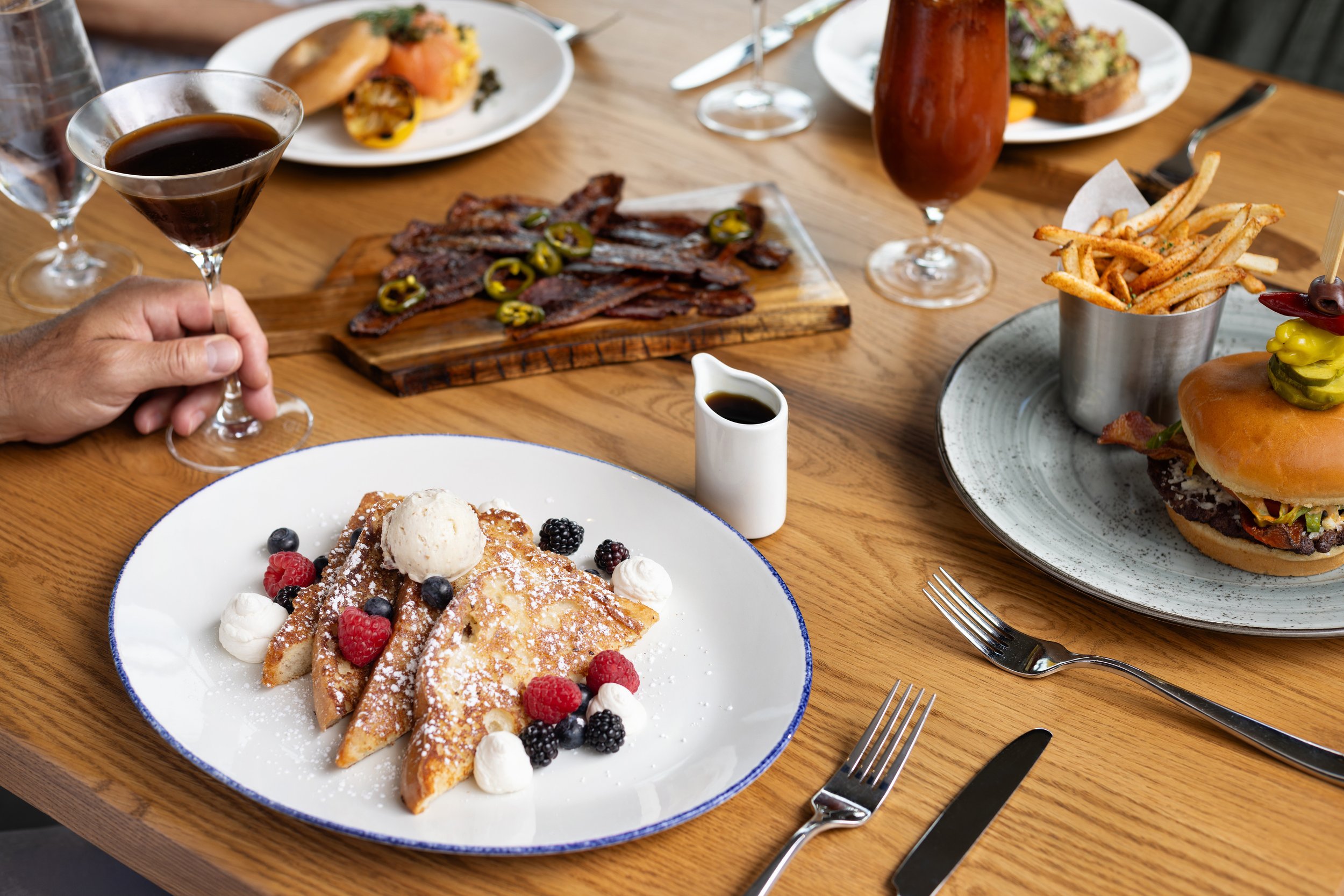 A table full of various foods including French toast with powdered sugar, berries, and a dollop of ice cream, a hamburger with pickles and toppings, a plate of ribs with jalapeño slices, French fries in a metal container, a glass of red drink with a