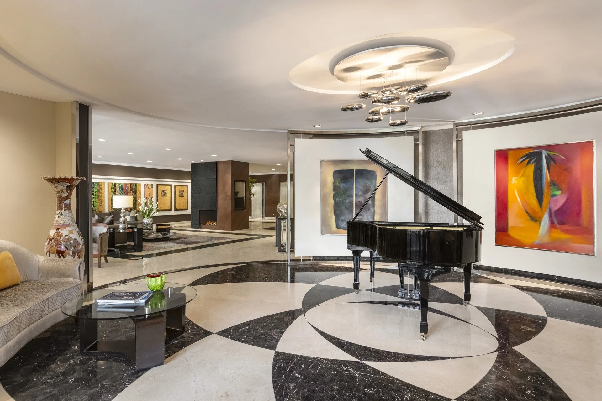 Interior of a hotel lobby with a black grand piano, colorful abstract paintings on the wall, modern chandelier, marble flooring, and seating area with a beige sofa and coffee table.