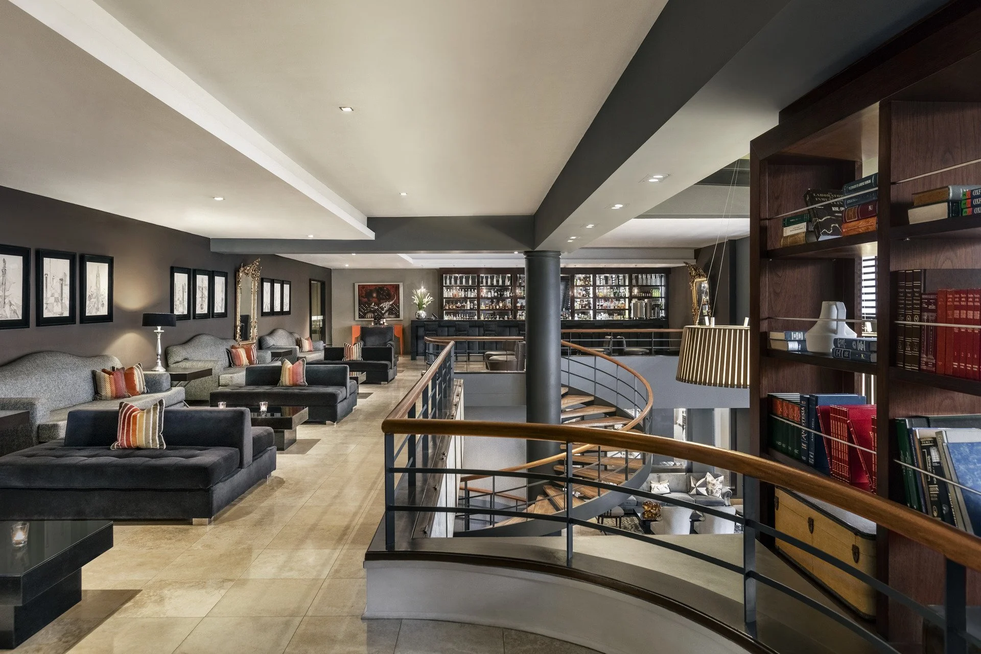 Modern hotel lobby with black and white furniture, abstract wall art, shelving with books and decor, and a cozy seating area with chairs and a marble table.