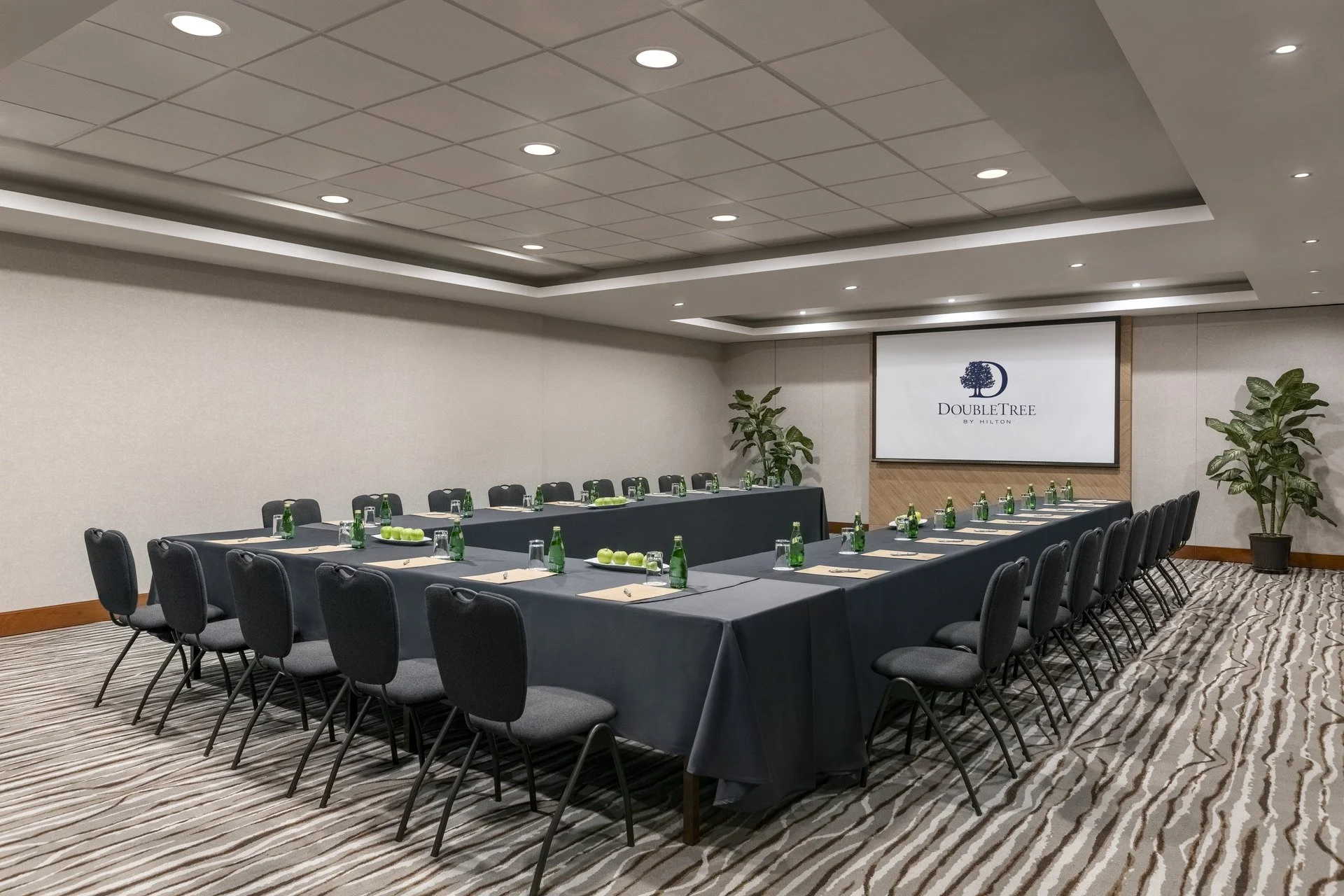 A conference room with a U-shaped table setup, black chairs, green bottled drinks, and a presentation screen displaying the DoubleTree Hilton logo. There are potted plants in the corners.