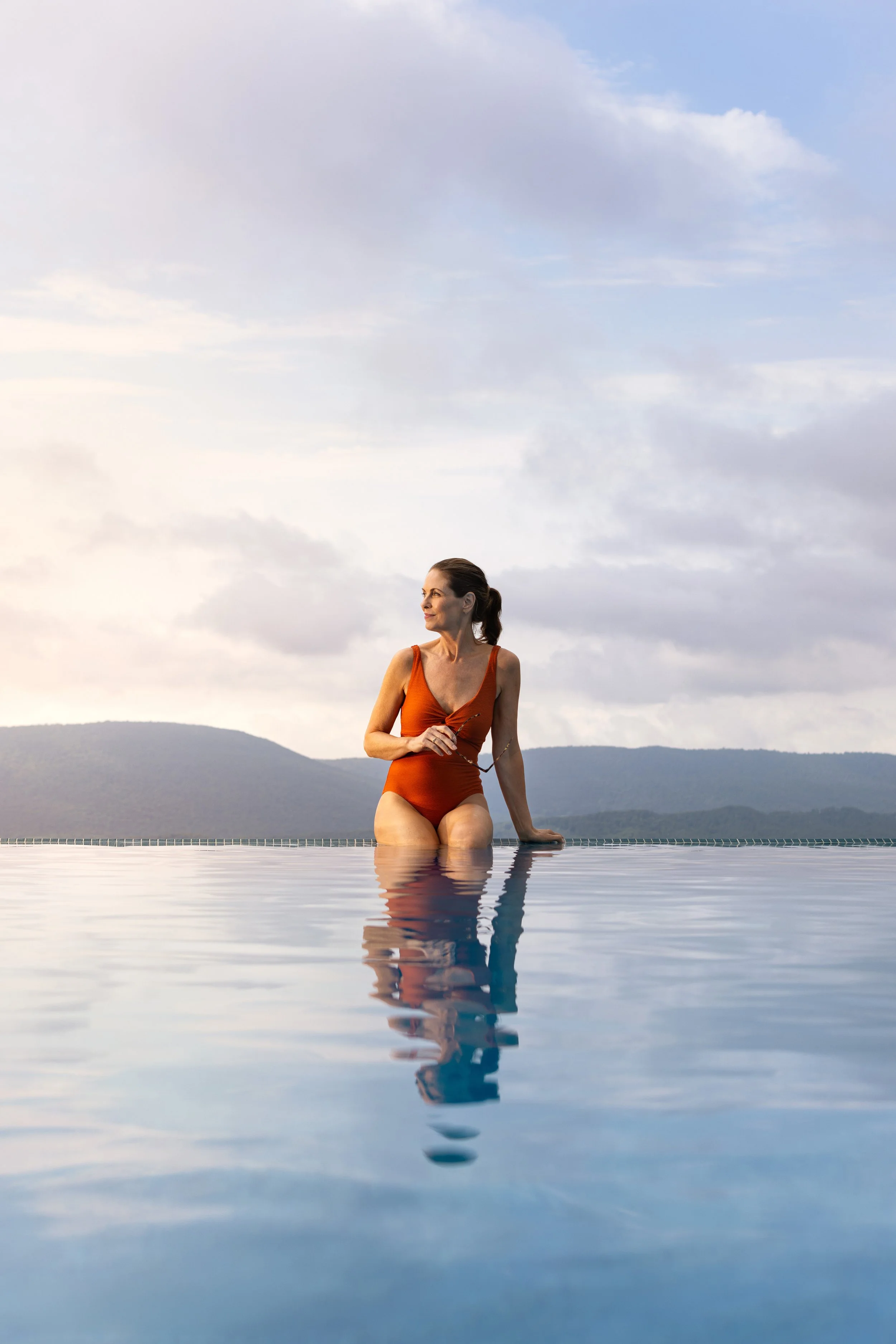 A woman in a rust-colored swimsuit sitting on the edge of an infinity pool, looking to the side, with mountains and sky in the background.
